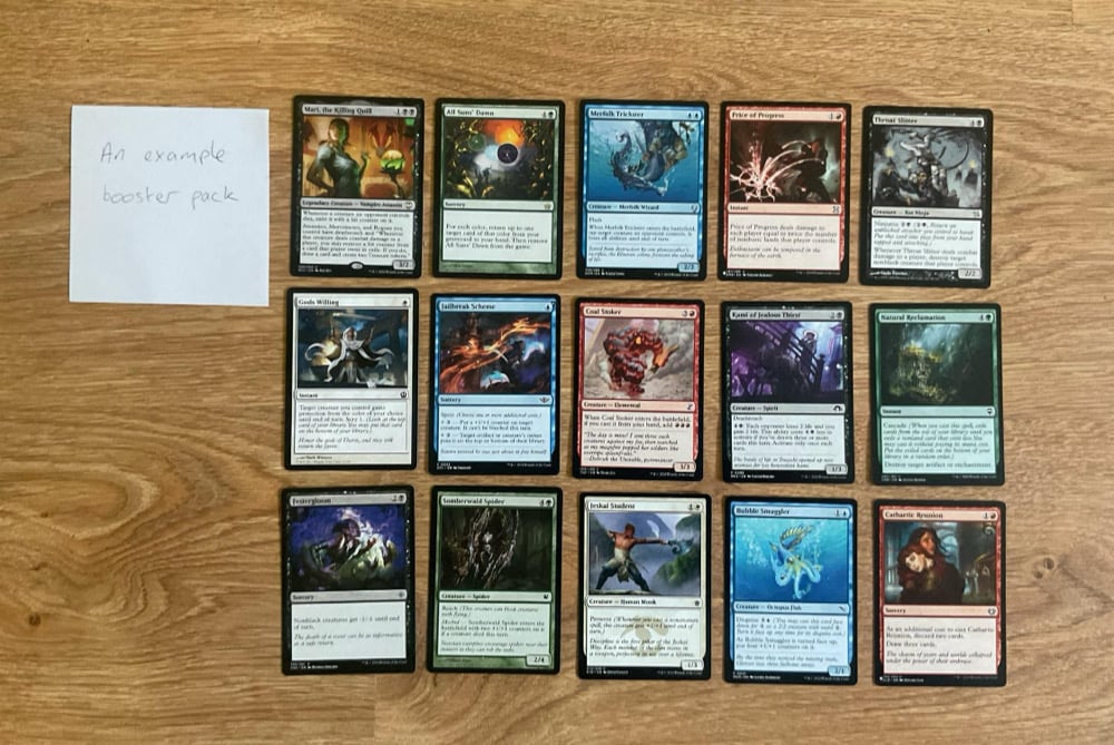 These packs have been made by myself and contain 2 rares, 3 uncommons and 10 commons. The commons will be colour balanced (2 of each) with some chance for multi coloured cards and/or colourless cards.